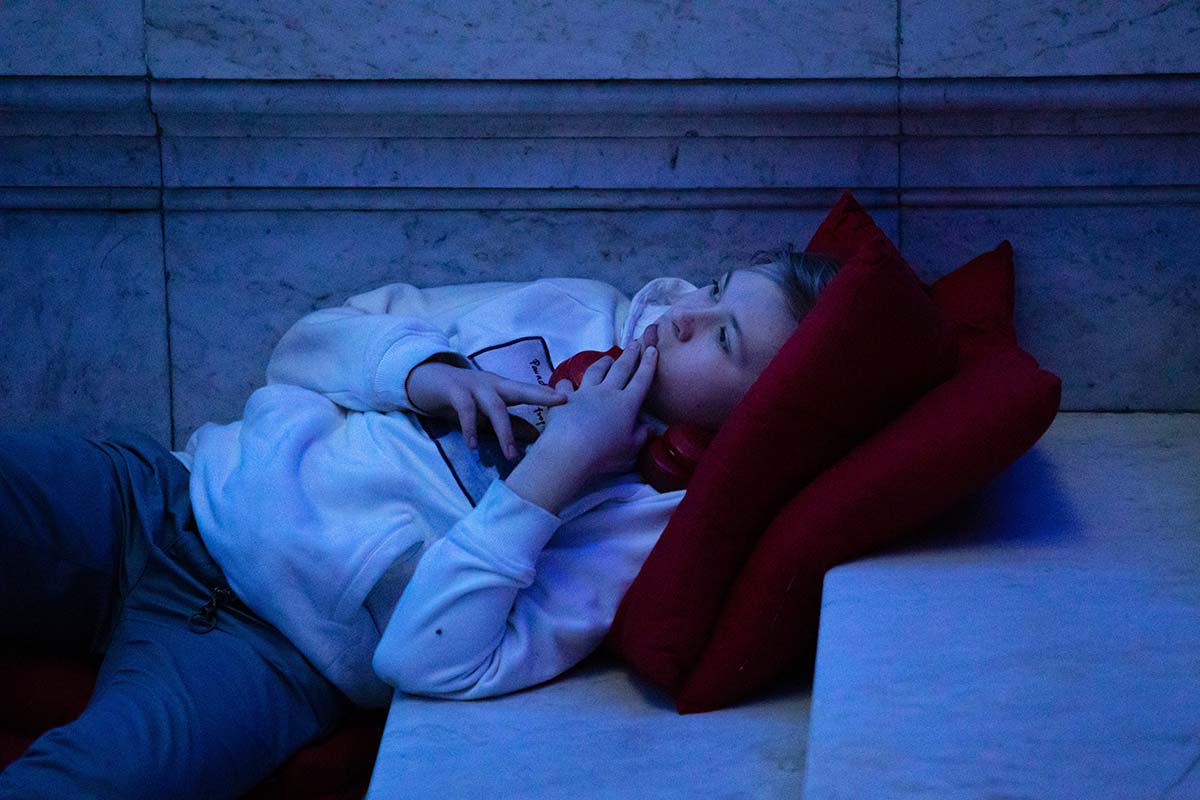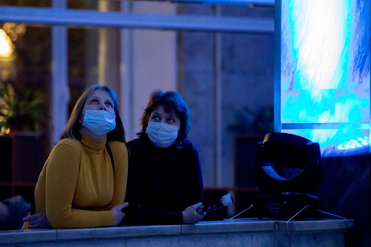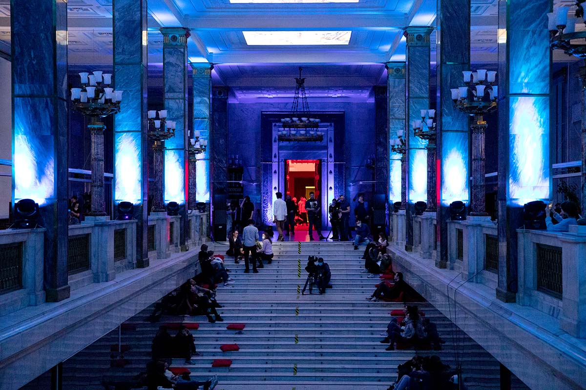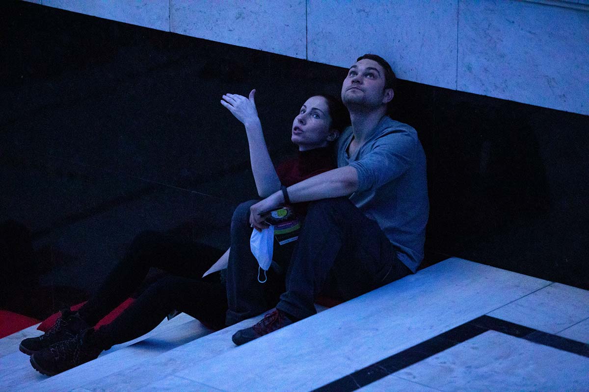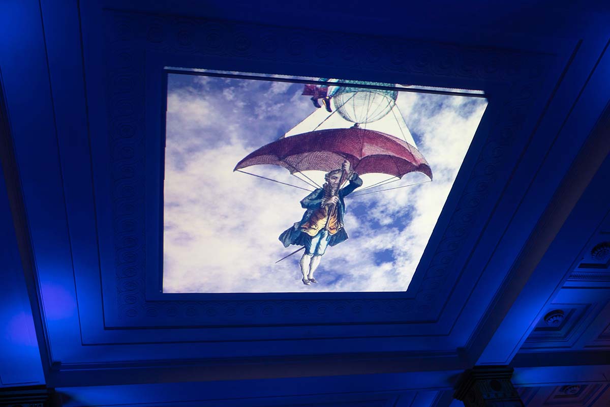 Расположившись на подушках на Мраморной лестнице, гости могли наблюдать на потолке библиотеки удивительное «космическое явление» — сплетение изображений мифических персонажей из книг, анимированные элементы из старинных атласов, космических карт и специально созданных видеокомпозиций.