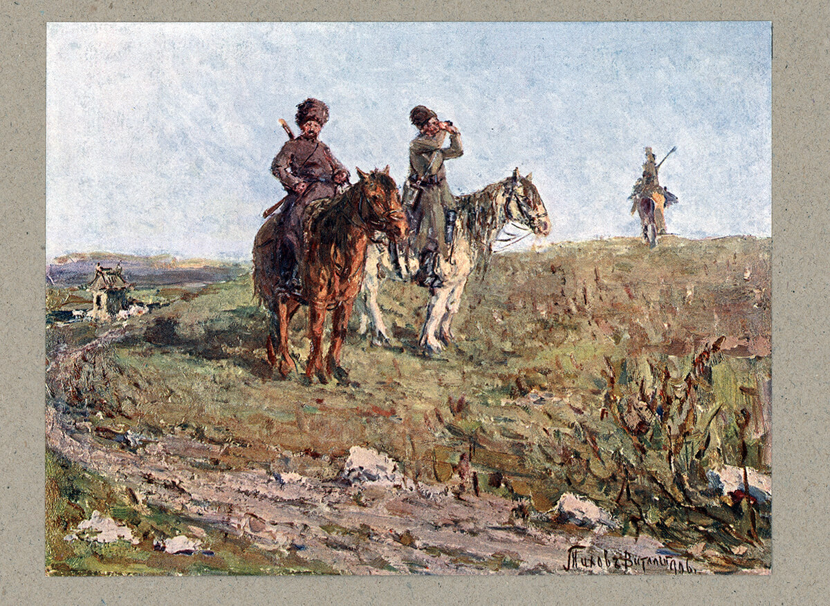 Репродукция картины В. Тихова «Казаки на разводке». Художественный альбом «Манджурия» (Русско-японская война). Санкт-Петербург, 1906. —
