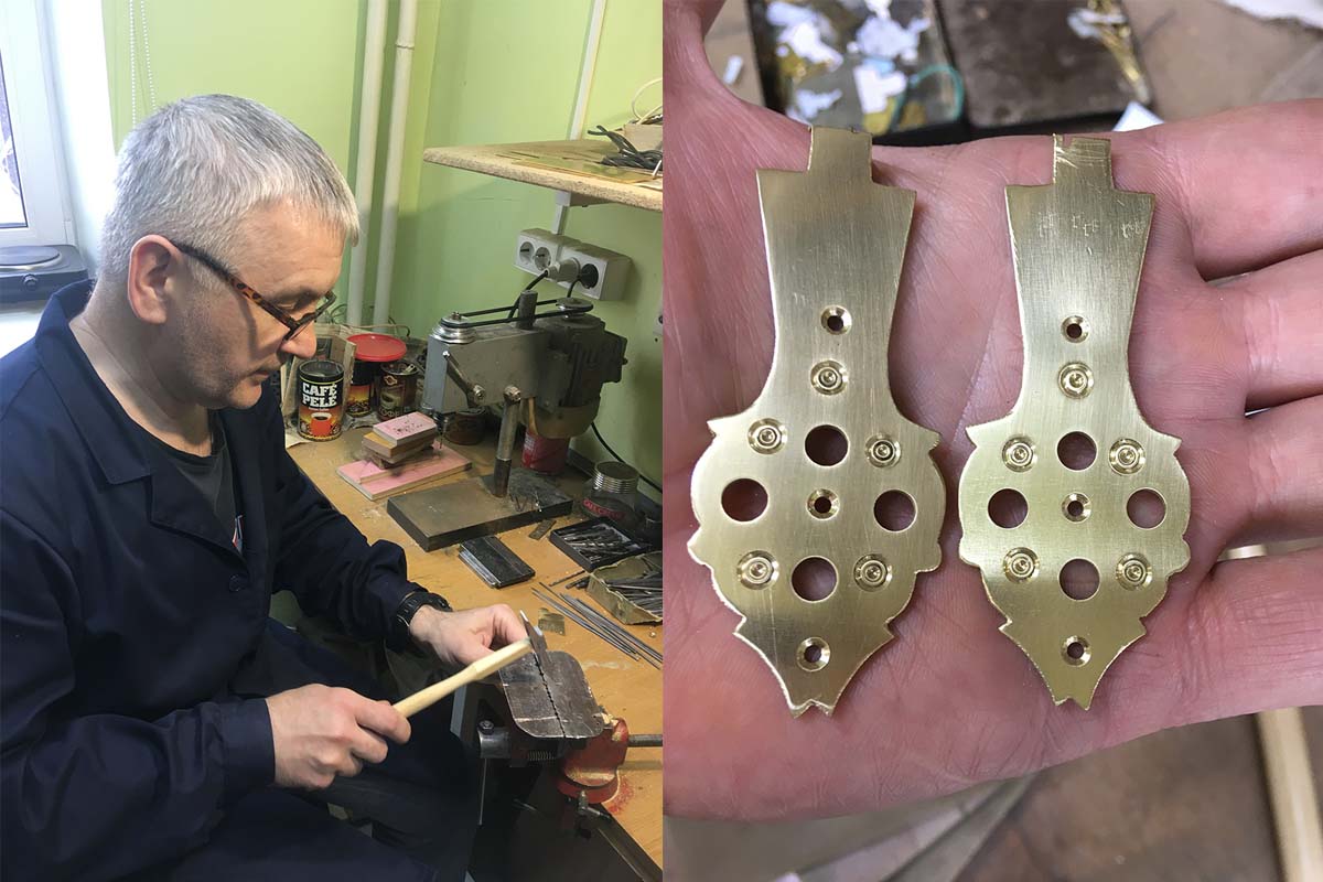 Игорь Григорьевич подготовил образцы латунных заготовок — на них новички будут постигать секреты технологии. Одна из главных задач мастер-класса — научиться правильно обращаться с инструментом. «От того, какой частью руки работает реставратор, очень много зависит: важно научиться работать кистью, а не плечом», — отмечает мастер.