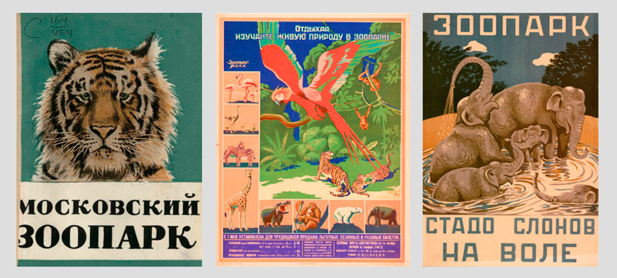 Слева направо: Московский Зоопарк // Московский рабочий. 1952. (Серия «По музеям и выставкам Москвы и Подмосковья».)