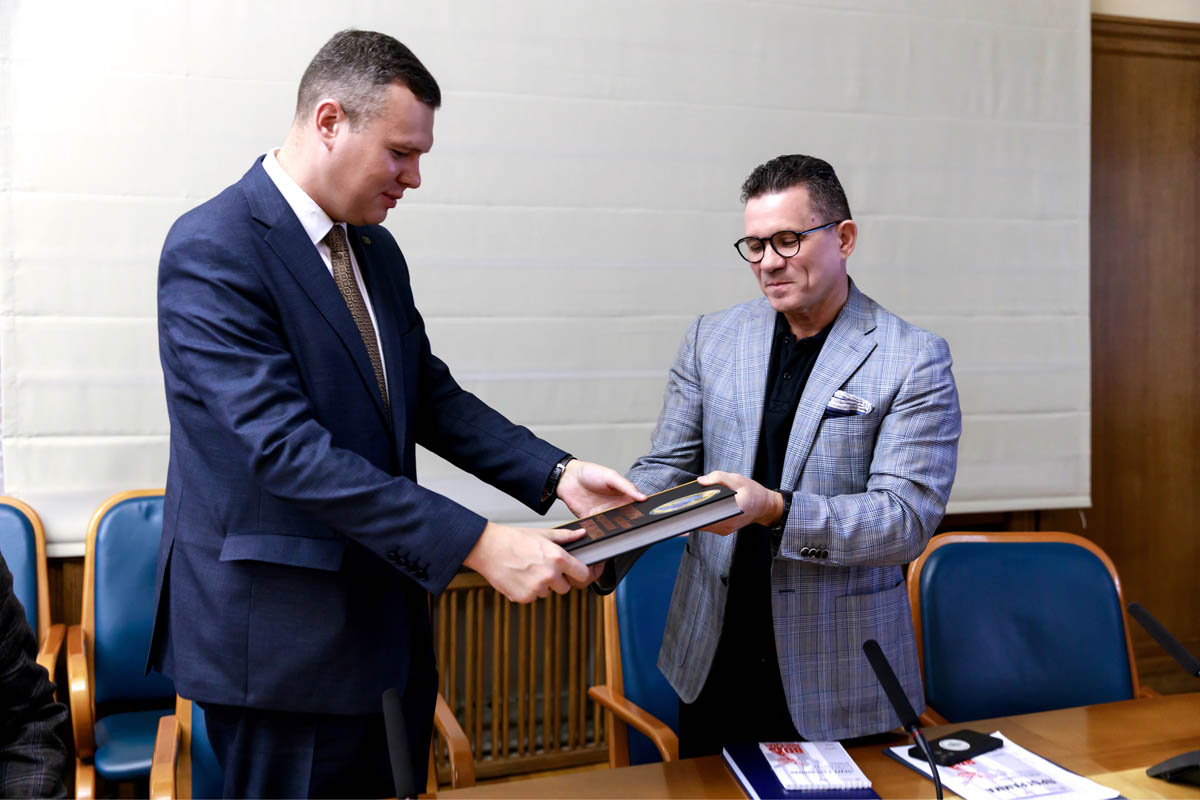 • Слева направо: Директор Центральной научной библиотеки имени Якуба Коласа Национальной академии наук Беларуси, кандидат исторических наук Станислав Юрецкий и директор РГБ, президент РБА, президент БАЕ Вадим Дуда