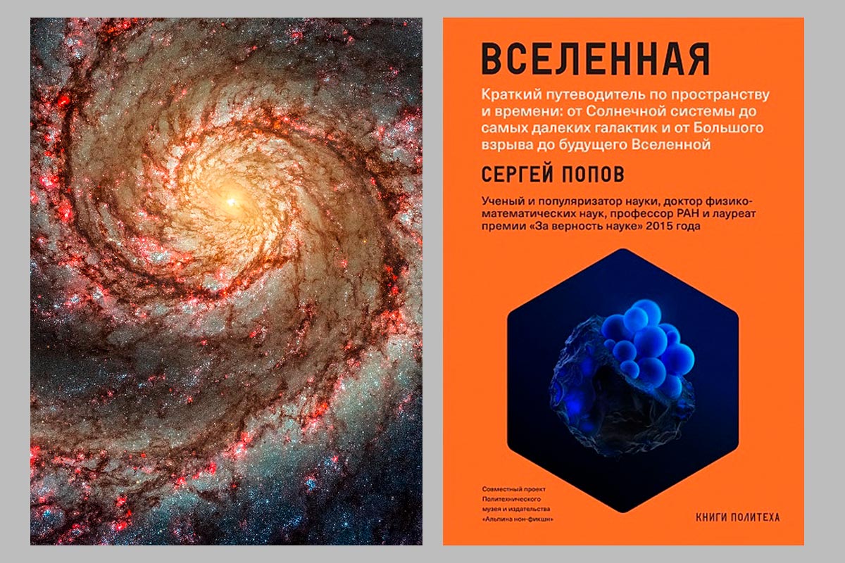 Спиральная галактика (фото NASA) и обложка книги Сергея Попова «Вселенная. Краткий путеводитель по пространству и времени: от Солнечной системы до самых далёких галактик и от Большого взрыва до будущего Вселенной»