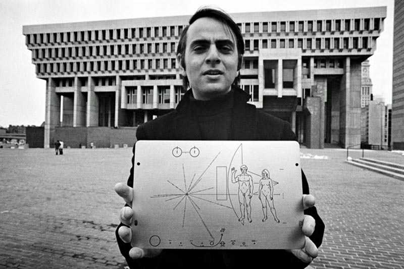 Карл Саган с металлической пластинкой, на которой выгравировано послание землян другим цивилизациям. Такие пластинки были отправлены в космос вместе с межзвёздными аппаратами «Пионер-10» и «Пионер-11». Фото: carlsagan.com