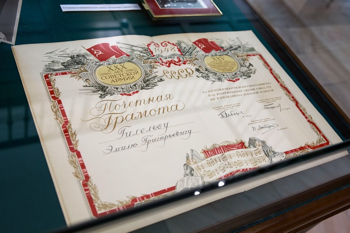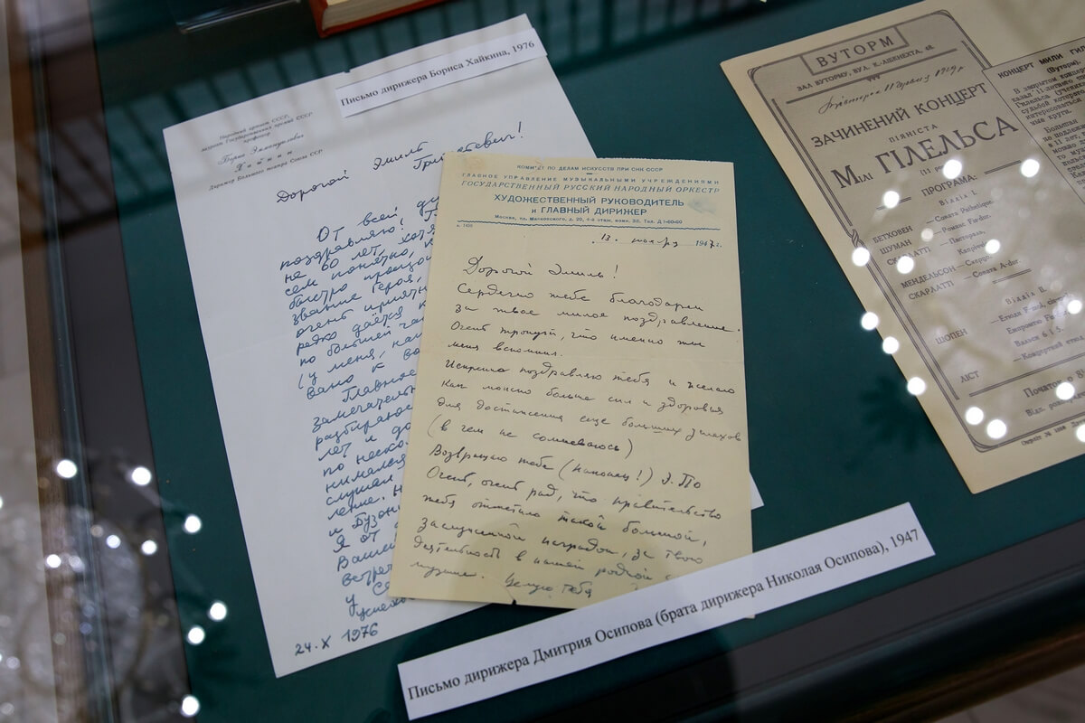 Особое внимание привлекает корреспонденция Эмиля Гилельса: на выставке можно увидеть дружеские послания от дирижёров Бориса Хайкина, Дмитрия Осипова, американского импресарио Сола Юрока, от коллектива Московского театра имени Маяковского, поздравительные телеграммы от Дмитрия Шостаковича, Леонида Утёсова, от артистов Марии Мироновой и Александра Менакера.