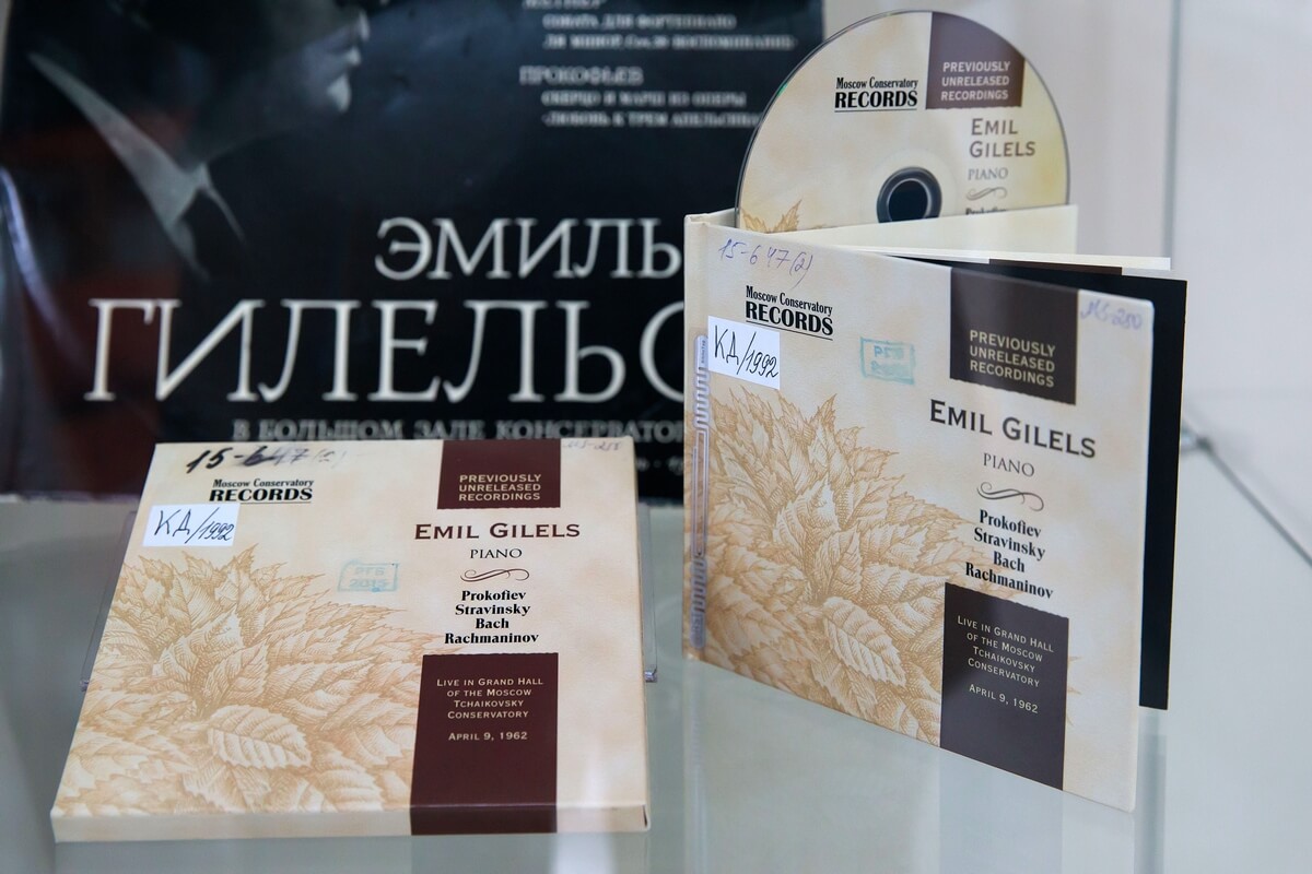Гилельс — единственный в мире пианист, осуществивший грамзаписи всех фортепианных концертов Бетховена, Брамса и Чайковского. Зарубежные и советские звукозаписывающие фирмы старались записать именно его интерпретации. Частью экспозиции стали некоторые пластинки с записями его выступлений, хранящиеся в фондах РГБ.