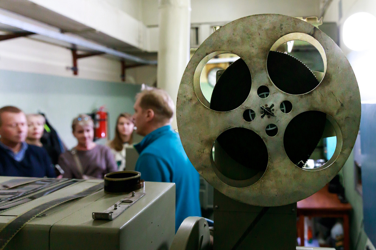 Посетителям рассказали об основных форматах кинолент, о принципах записи звука в кинофильмах, и продемонстрировали, как работает легендарная киноустановка 23КПК ЛОМО.