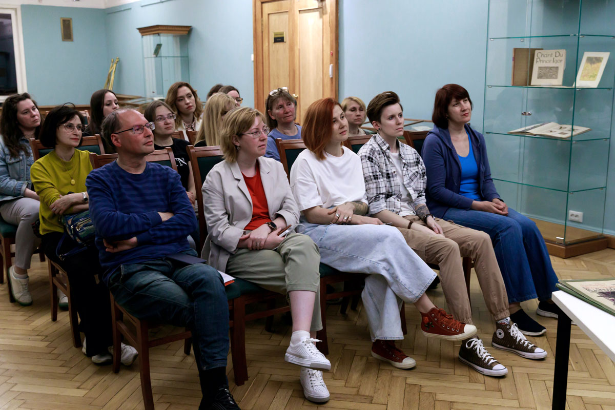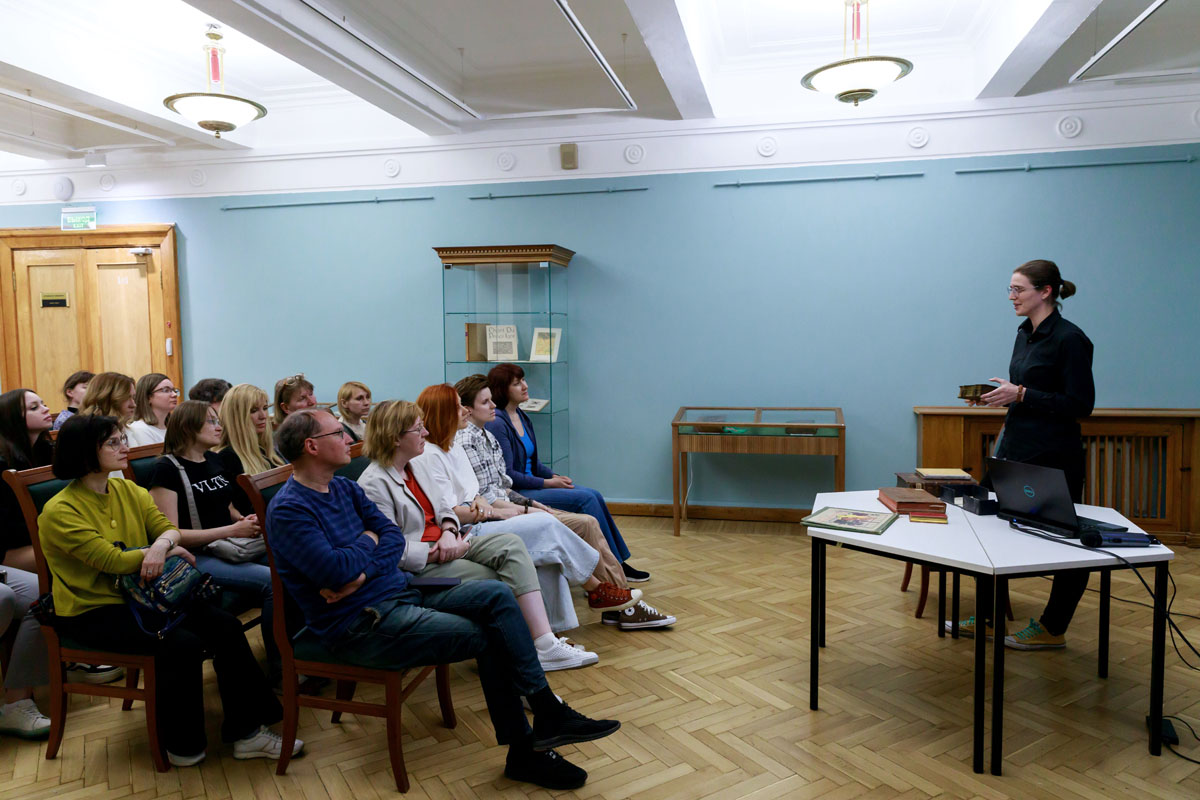 Слушатели окунулись в мир искусства книги, где все элементы — формат, иллюстрации, переплёт, сорт бумаги, шрифт — в комплексе формируют её эстетический образ. Лекция сопровождалась показом замечательных образцов книжного искусства, часть из которых гости рассмотрели подробнее в витринах лекционного зала.