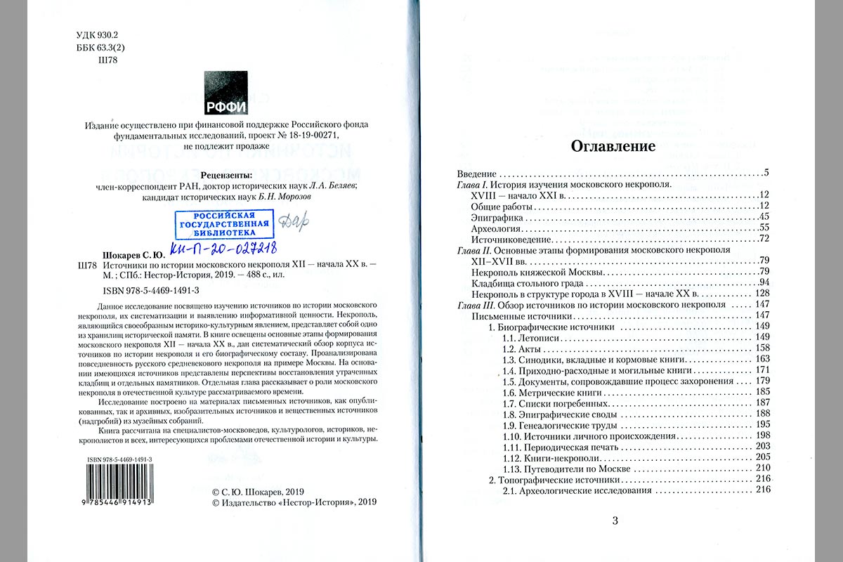 Шокарев, Сергей Юрьевич. Источники по истории Московского некрополя XII — начала XX века. Москва; Санкт-Петербург, 2019.