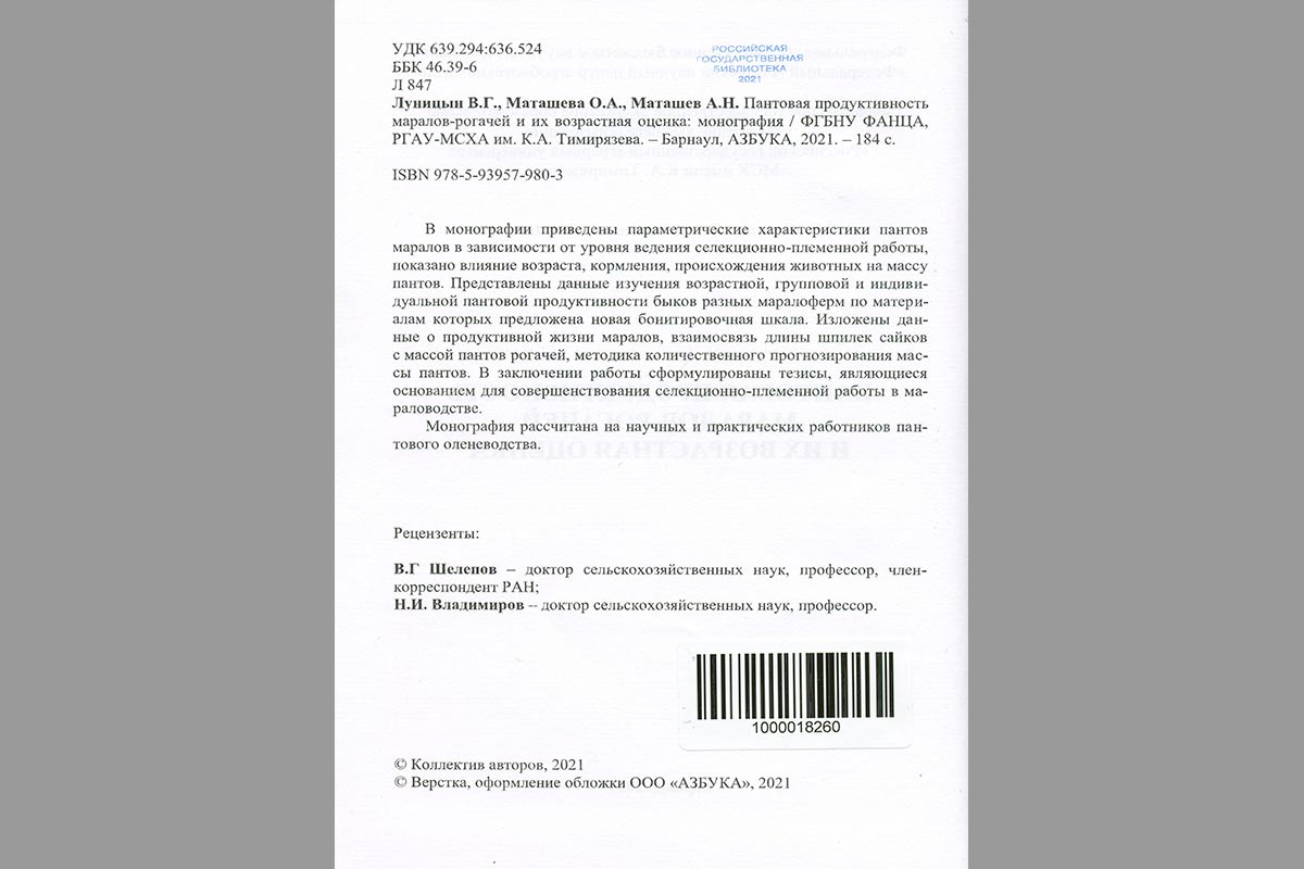 Луницын, Василий Герасимович. Пантовая продуктивность маралов-рогачей и их возрастная оценка. Барнаул, 2021.