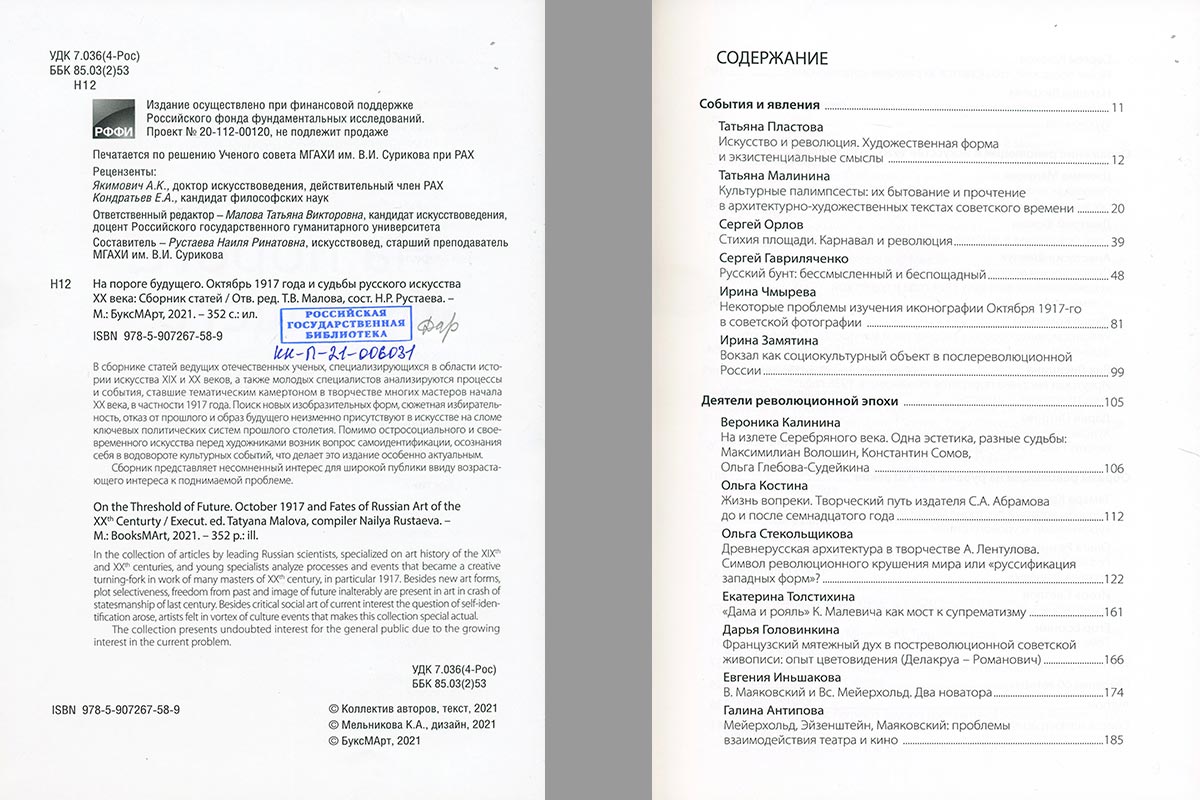 На пороге будущего. Октябрь 1917 года и судьбы русского искусства XX века. Москва, 2021.