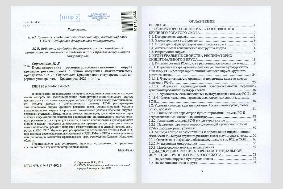 Строганова, Ирина Яковлевна. Культивирование респираторно-синцитиального вируса крупного рогатого скота с целью получения диагностических препаратов. Красноярск, 2021.