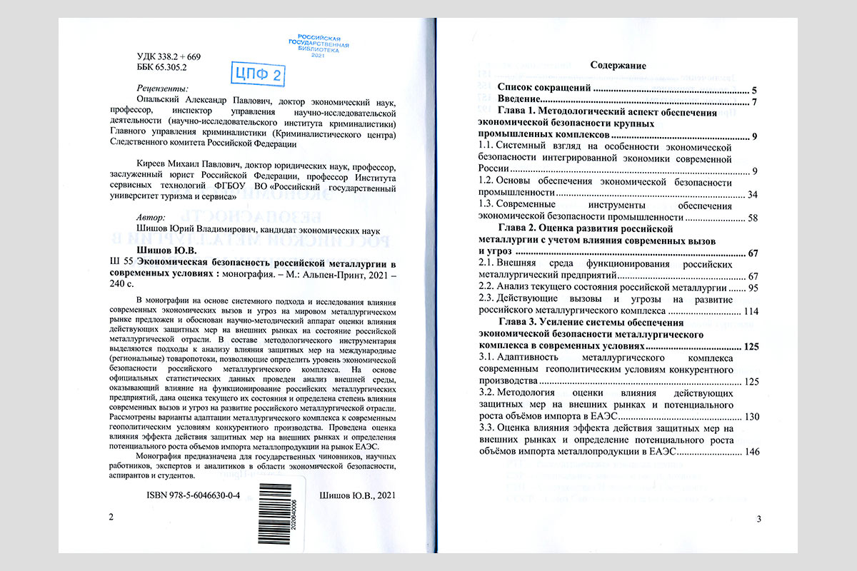 Шишов, Юрий Владимирович. Экономическая безопасность российской металлургии в современных условиях. Москва, 2021.
