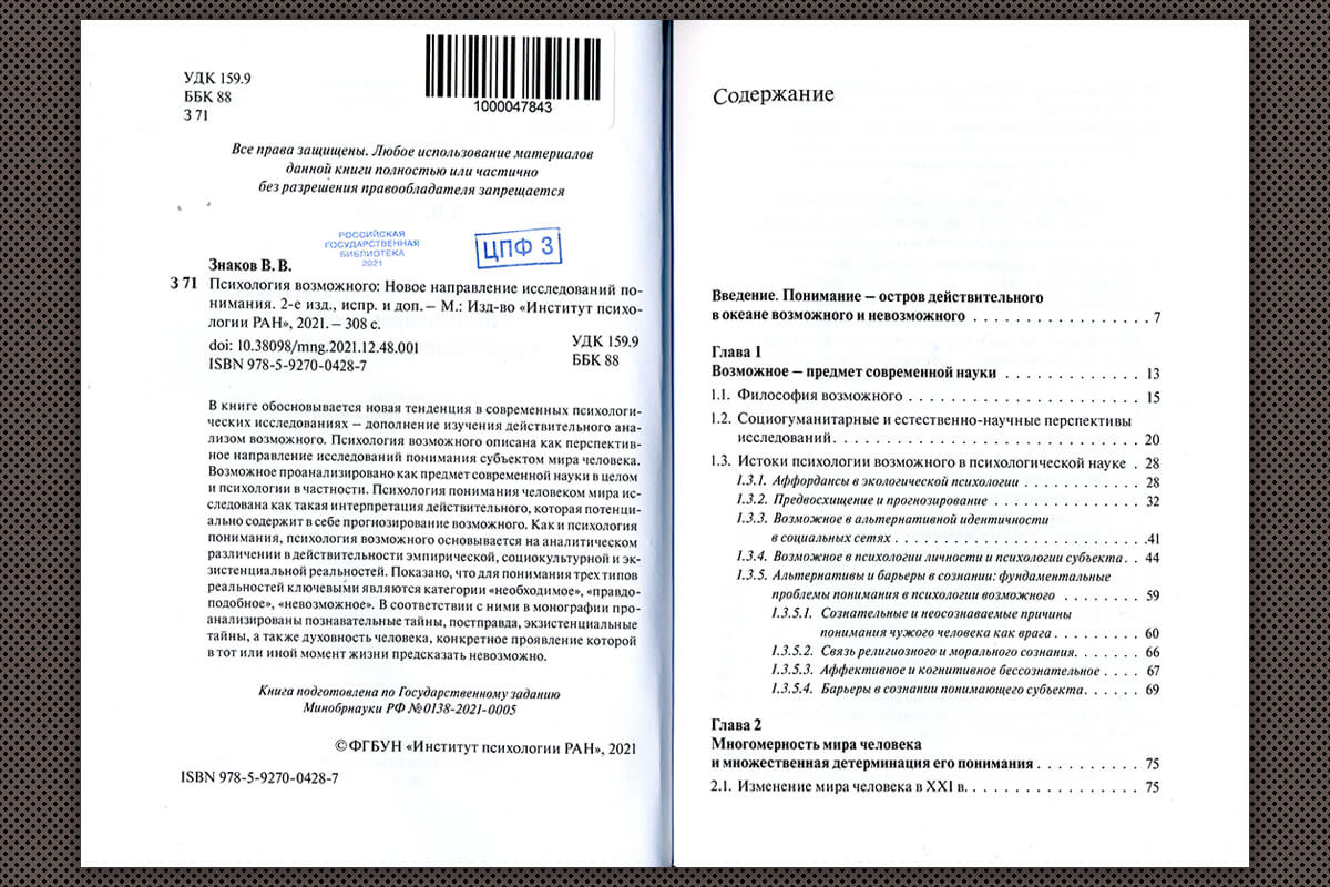 Знаков, Виктор Владимирович. Психология возможного: новое направление исследований понимания. Москва, 2020