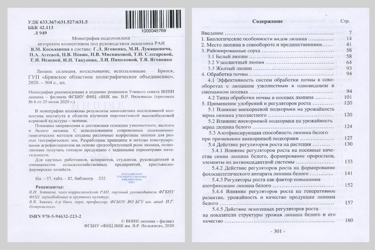 Люпин: селекция, возделывание, использование. Брянск, 2020.
