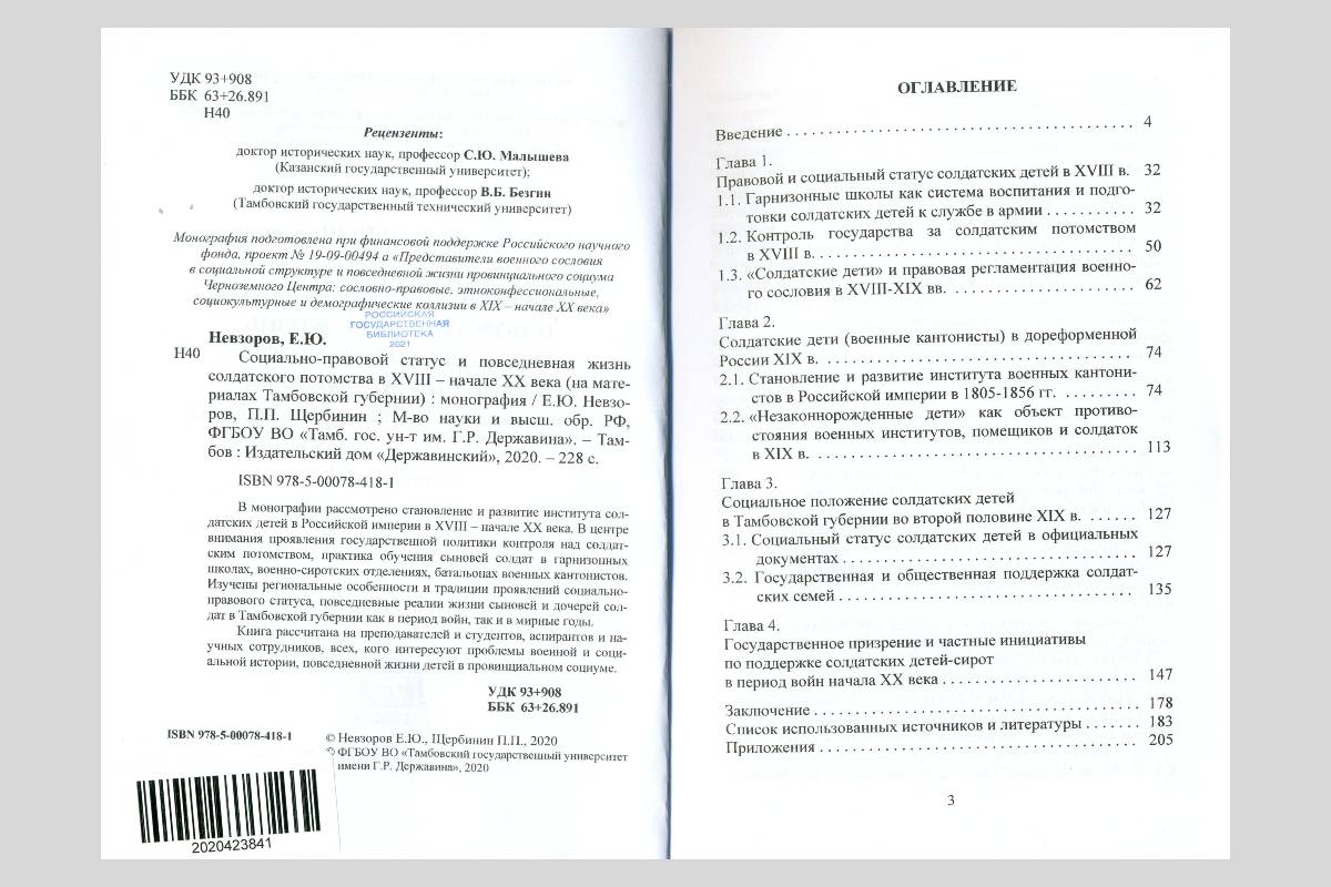 Невзоров, Евгений Юрьевич. Социально-правовой статус и повседневная жизнь солдатского потомства в XVIII — начале XX века (на материалах Тамбовской губернии). Тамбов, 2020.