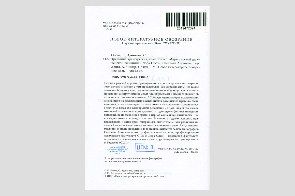 Олсон, Лора. Традиция, трансгрессия, компромисс: миры русской деревенской женщины. Москва, 2021.
