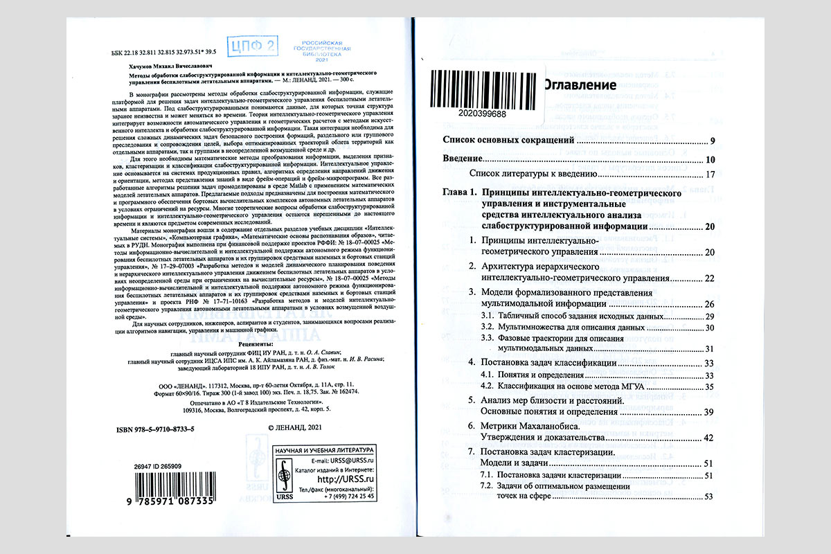 Хачумов, Михаил Вячеславович. Методы обработки слабоструктурированной информации и интеллектуально-геометрического управления беспилотными летательными аппаратами. Москва, 2021.