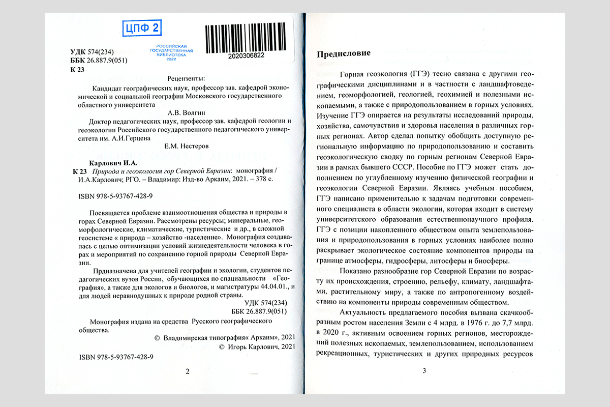 Карлович, Игорь Анатольевич. Природа и геоэкология гор Северной Евразии. Владимир, 2021.