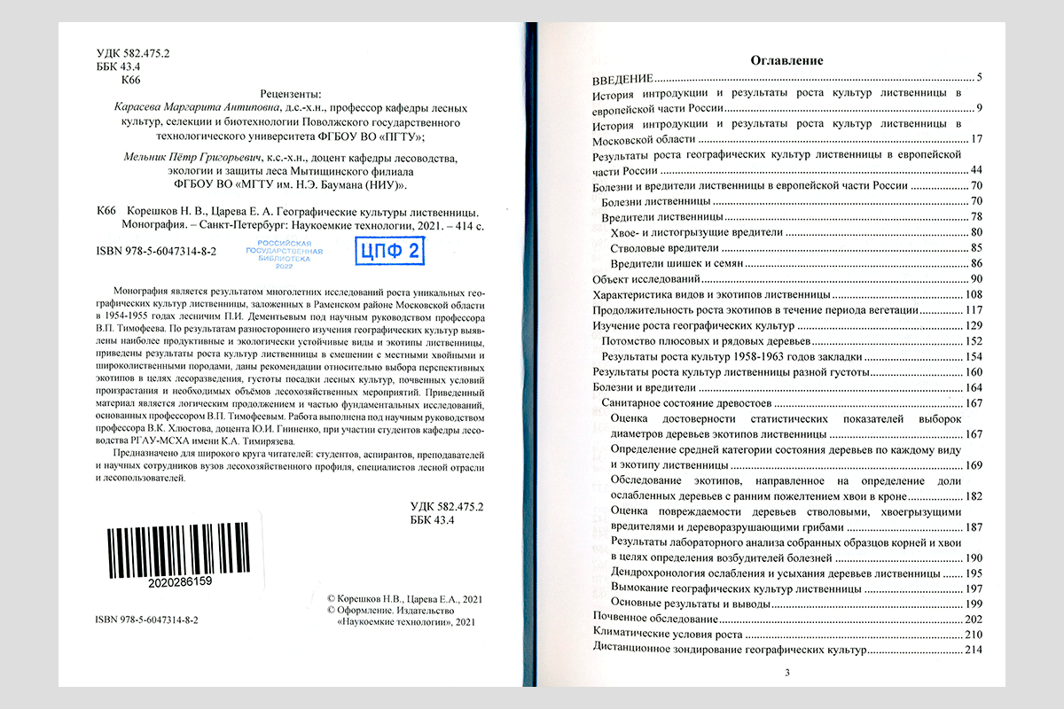 Корешков, Николай Владимирович. Географические культуры лиственницы. Санкт-Петербург, 2021.
