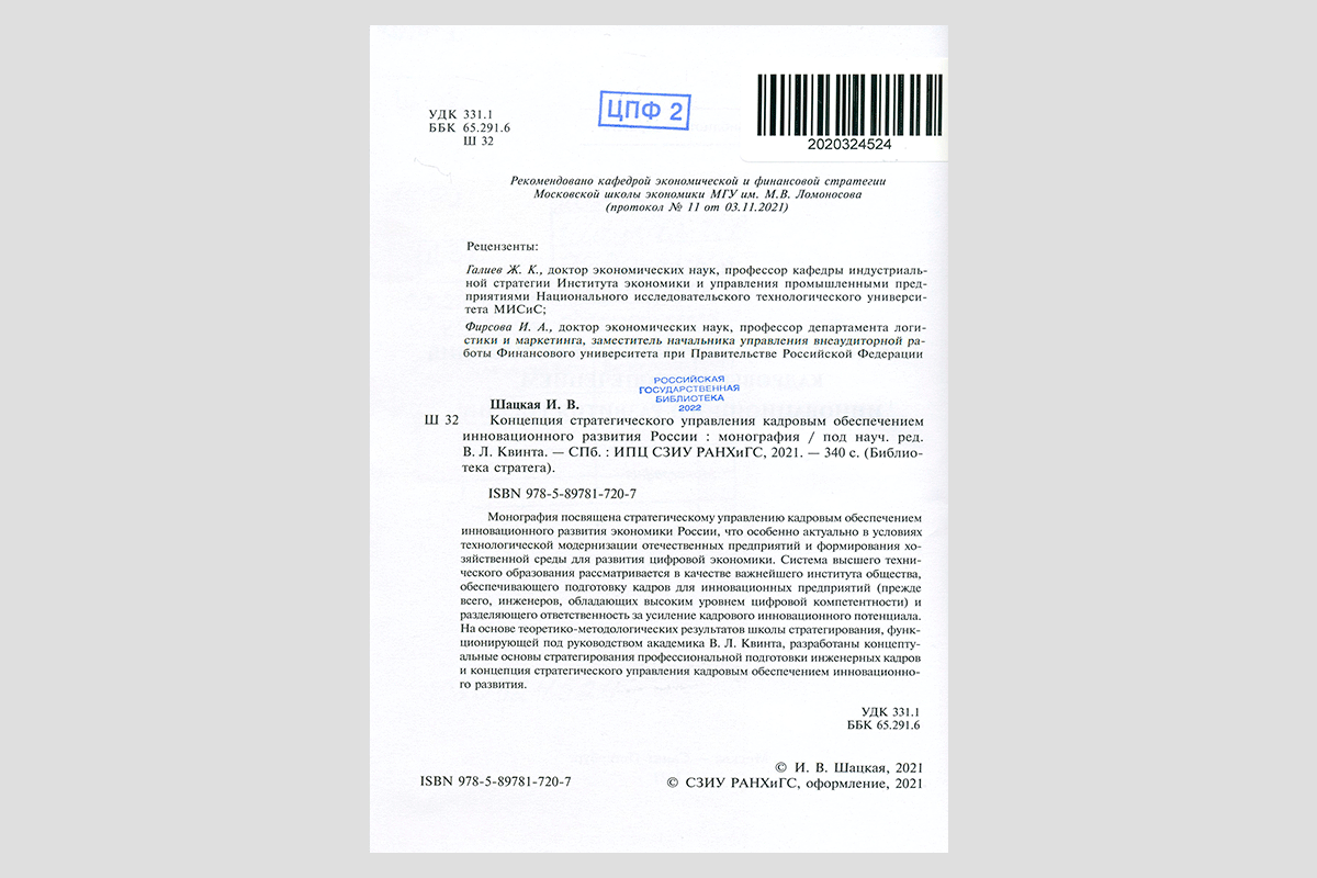 Шацкая, Ирина Вячеславовна. Концепция стратегического управления кадровым обеспечением инновационного развития России. Москва, 2021.