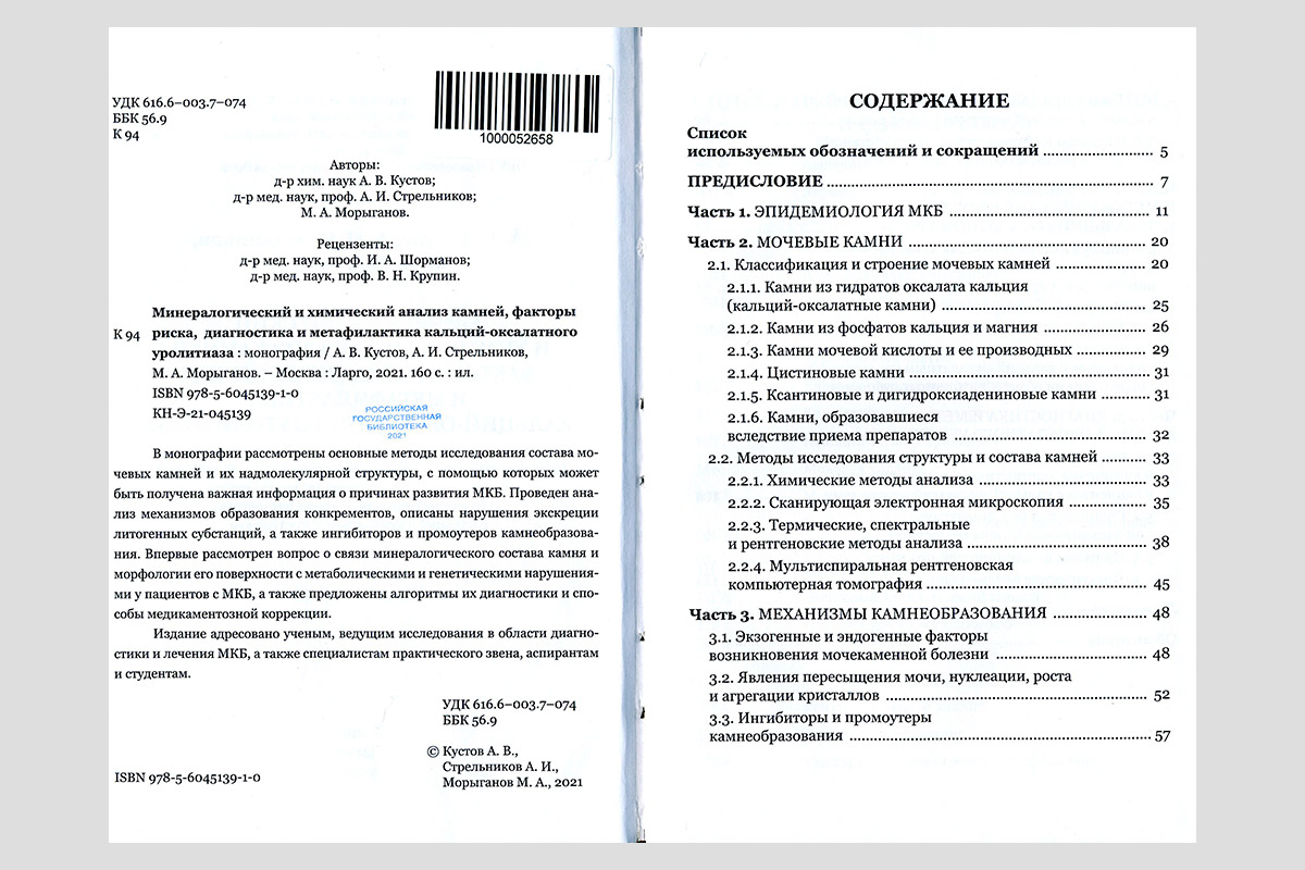 Кустов, Андрей Владимирович. Минералогический и химический анализ камней, факторы риска, диагностика и метафилактика кальций-оксалатного уролитиаза: состав и строение камней, механизмы камнеобразования, метаболические нарушения, диагностика и патогенетическое лечение пациентов с кальций-оксалатным уролитиазом. Москва, 2021.