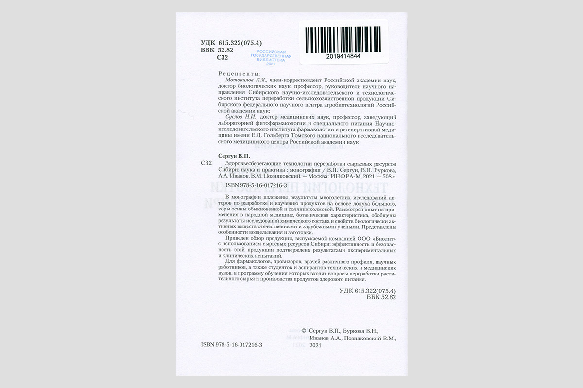 Здоровьесберегающие технологии переработки сырьевых ресурсов Сибири. Наука и практика. Москва, 2021.