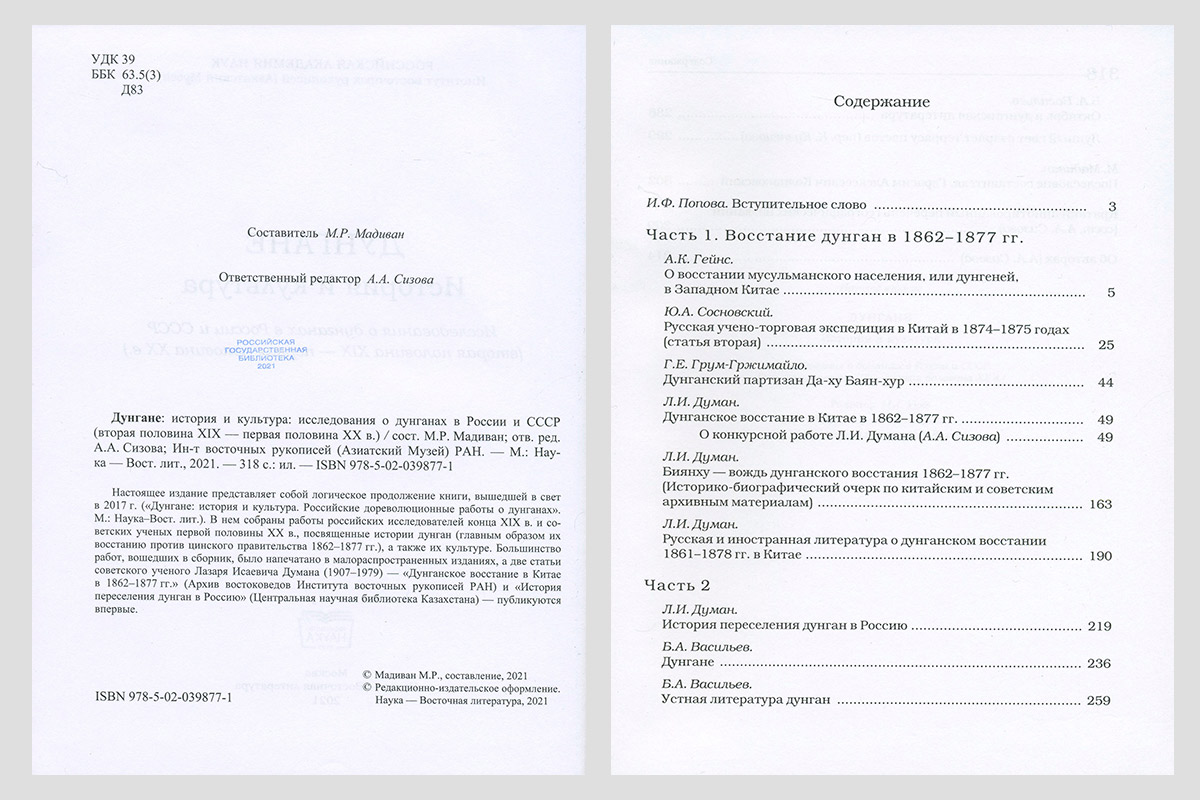 Дунгане. История и культура: исследования о дунганах в России и СССР (вторая половина XIX — первая половина XX в.). Москва, 2021.