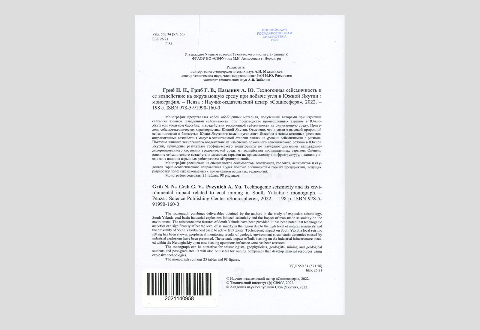 Гриб, Николай Николаевич. Техногенная сейсмичность и её воздействие на окружающую среду при добыче угля в Южной Якутии. Пенза, 2022