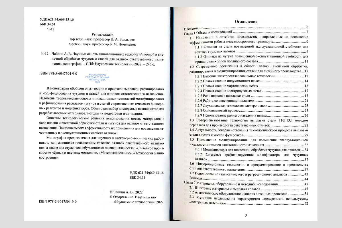Чайкин, Андрей Владимирович. Научные основы инновационных технологий печной и внепечной обработки чугунов и сталей для отливок ответственного назначения. Санкт-Петербург, 2022.