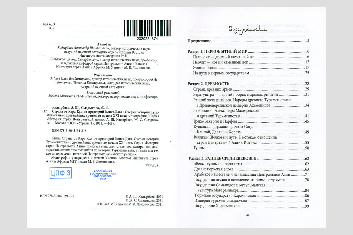 Кадырбаев, Александр Шайдатович. Страна от Кара-Кум до предгорий Копет-Дага: очерки истории Туркменистана с древнейших времен до начала XXI века. Москва, 2021.