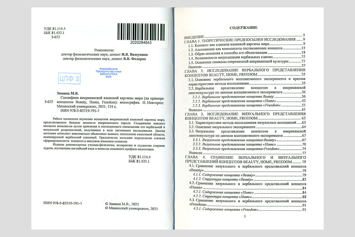 Зимина, Мария Викторовна. Специфика американской языковой картины мира: (на примере концептов Beauty, Home, Freedom). Нижний Новгород, 2021.