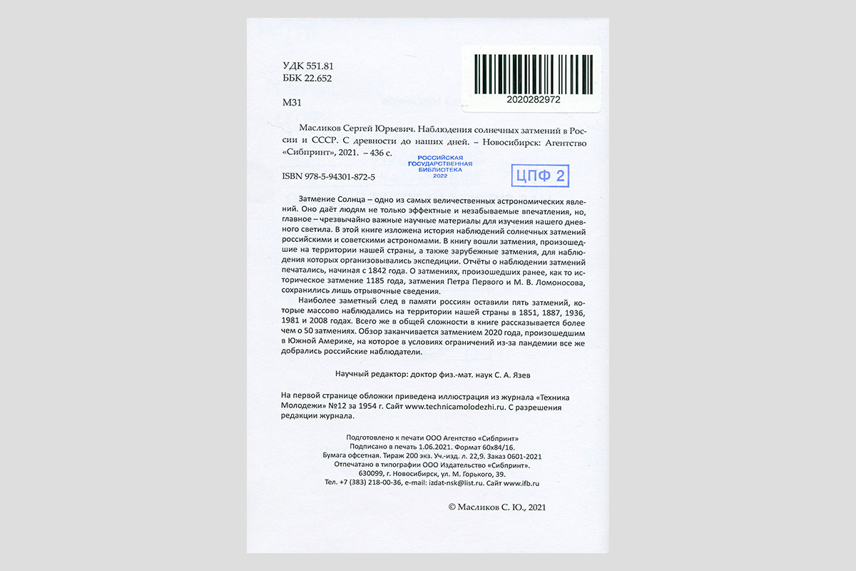 Масликов, Сергей Юрьевич. Наблюдения солнечных затмений в России и СССР. С древности до наших дней. Новосибирск, 2021.