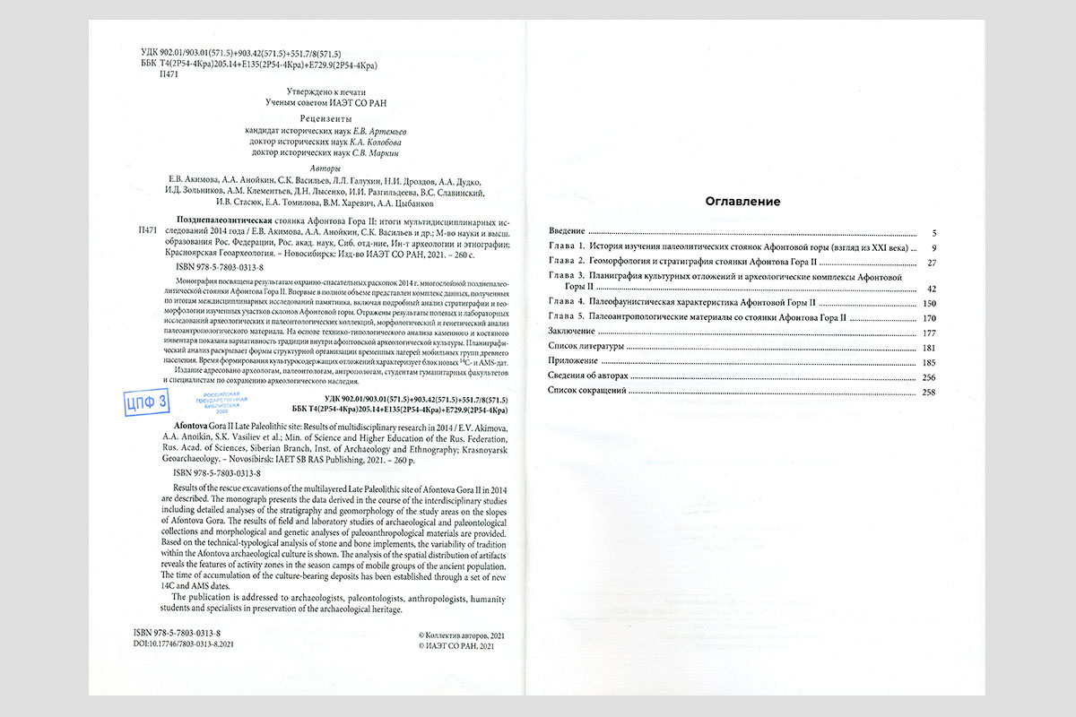 Позднепалеолитическая стоянка Афонтова Гора II: итоги мультидисциплинарных исследований 2014 года. Новосибирск, 2021.