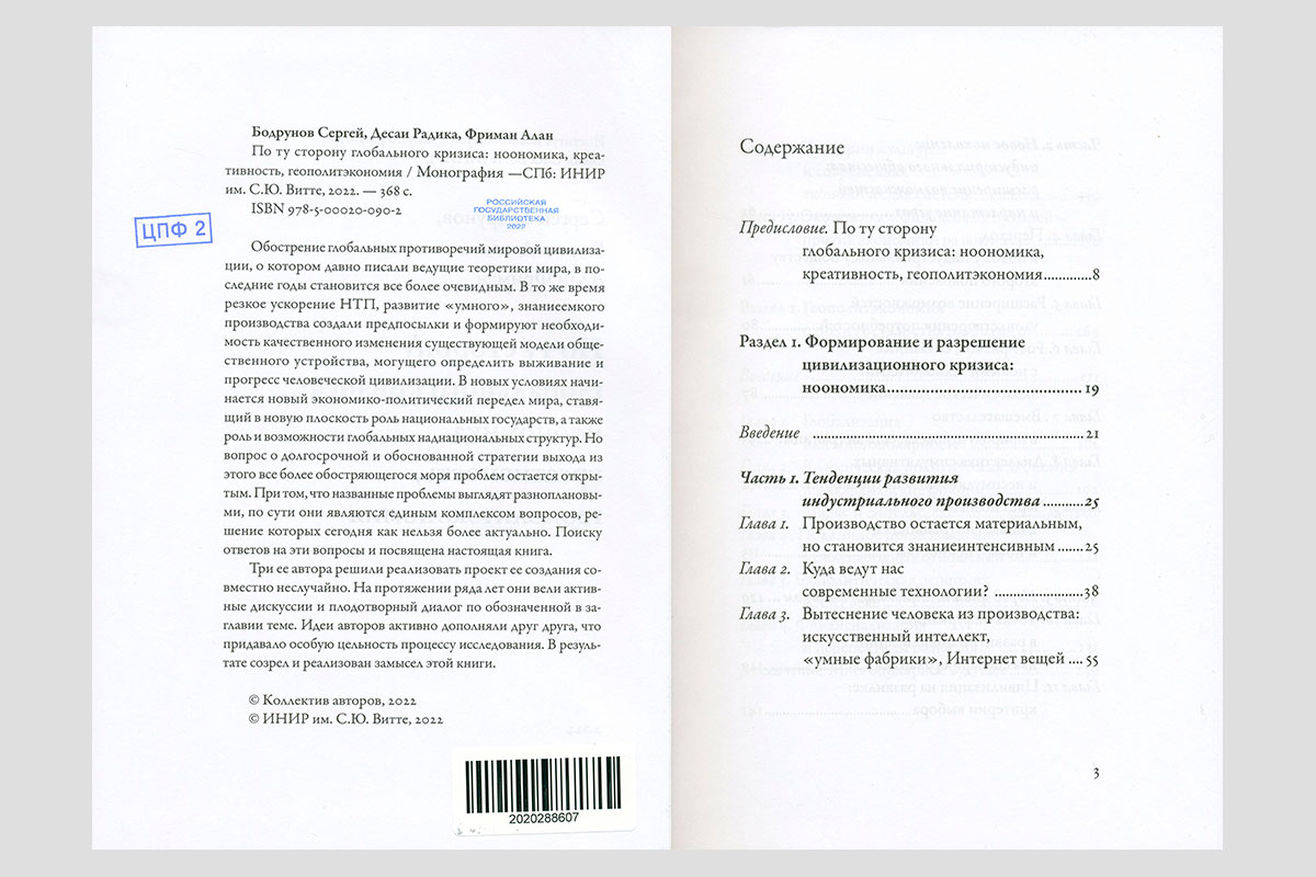 Бодрунов, Сергей Дмитриевич. По ту сторону глобального кризиса: ноономика, креативность, геополитэкономия. Санкт-Петербург, 2022.