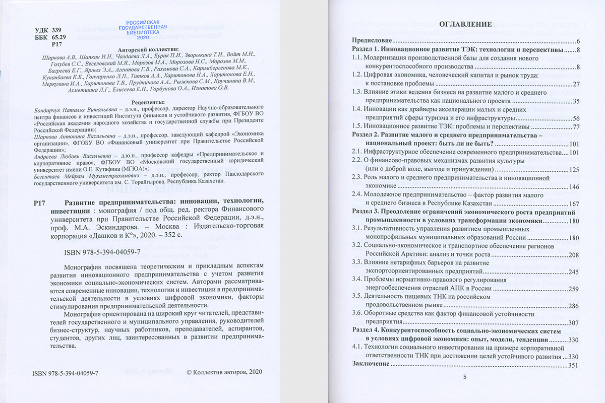 Развитие предпринимательства: инновации, технологии, инвестиции. Москва, 2020.