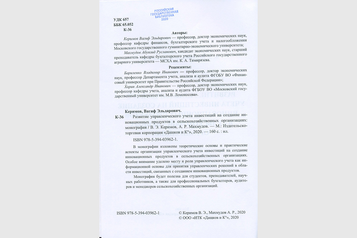 Керимов, Вагиф Эльдар оглы. Развитие управленческого учета инвестиций на создание инновационных продуктов в сельскохозяйственных организациях. Москва, 2020.