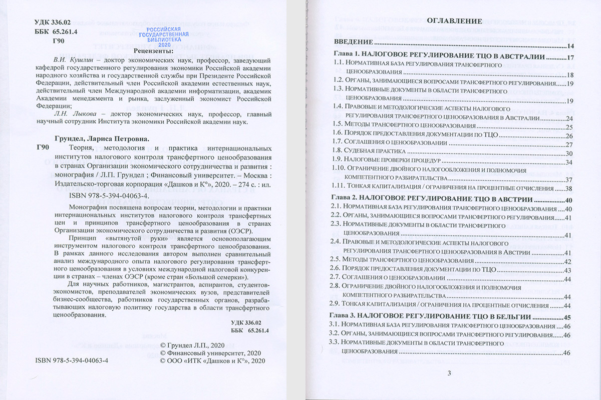 Грундел, Лариса Петровна. Теория, методология и практика интернациональных институтов налогового контроля трансфертного ценообразования в странах организации экономического сотрудничества и развития. Москва, 2020.