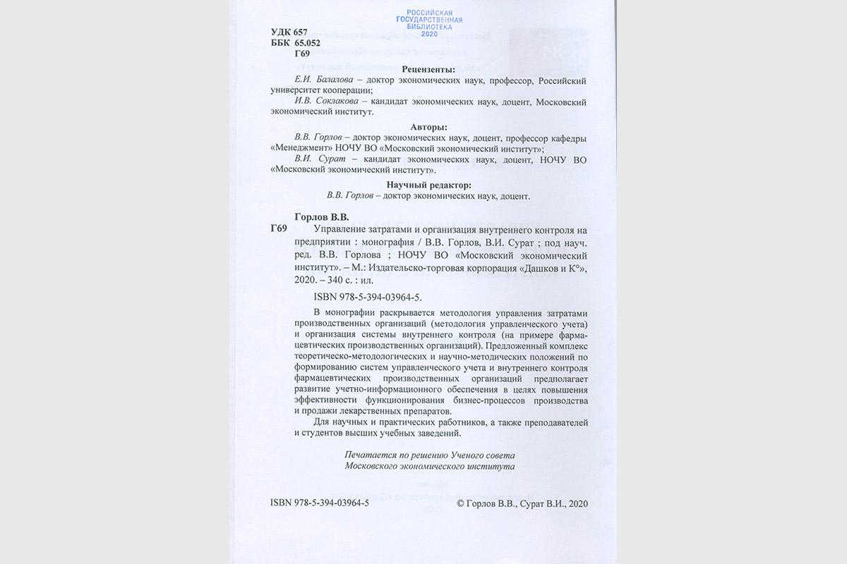 Горлов, Виктор Владимирович. Управление затратами и организация внутреннего контроля на предприятии. Москва, 2020.
