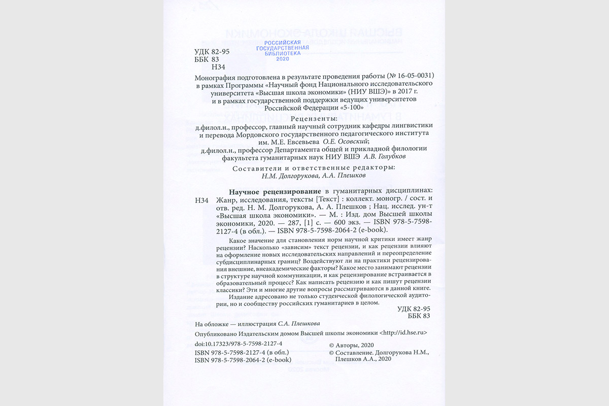 Научное рецензирование в гуманитарных дисциплинах. Жанр, исследования, тексты. Москва, 2020.