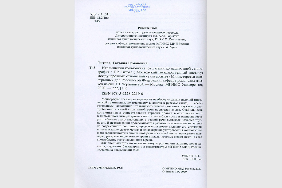 Титова, Татьяна Романовна. Итальянский конъюнктив: от латыни до наших дней. Москва, 2020.