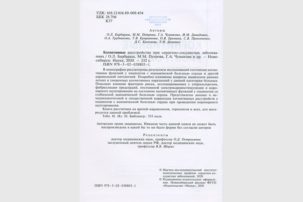 Когнитивные расстройства при сердечно-сосудистых заболеваниях. Новосибирск, 2020.