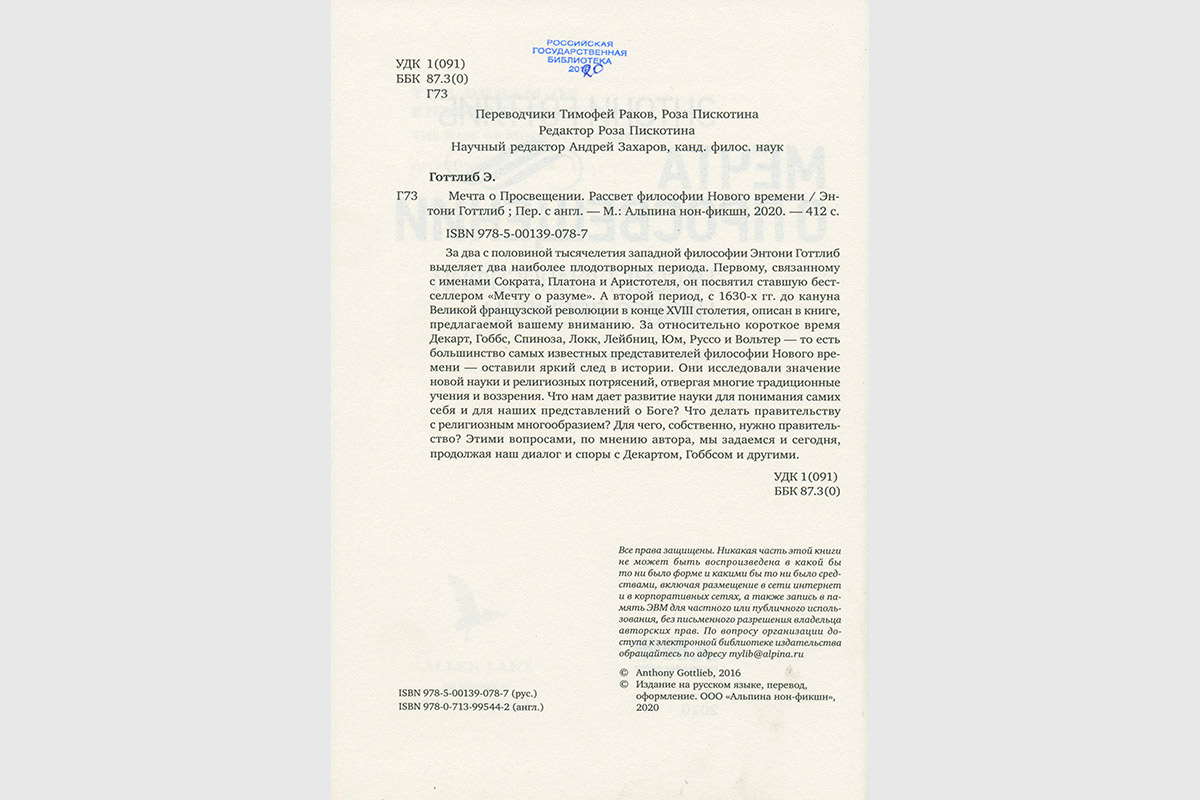 Готтлиб, Энтони. Мечта о просвещении: рассвет философии Нового времени. Москва, 2020.