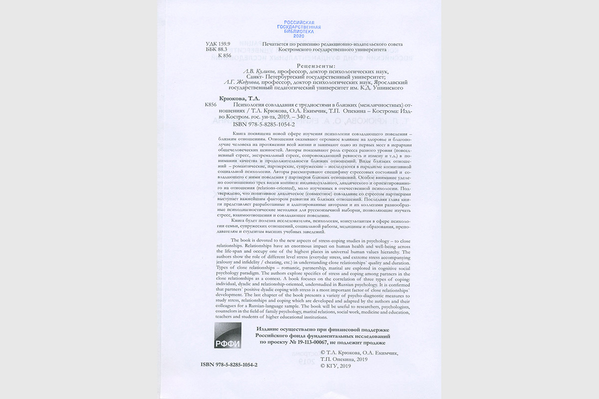 Крюкова, Татьяна Леонидовна. Психология совладания с трудностями в близких (межличностных) отношениях. Кострома, 2019.