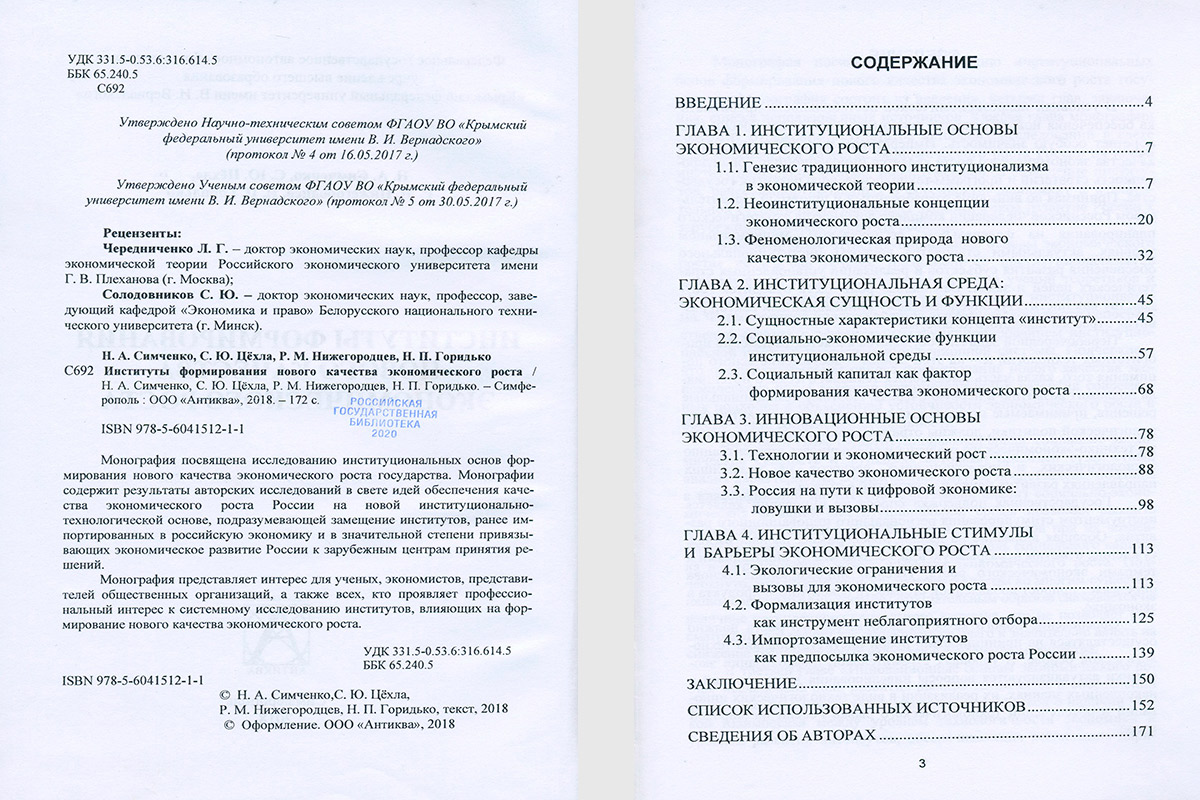 Институты формирования нового качества экономического роста. Симферополь, 2018.