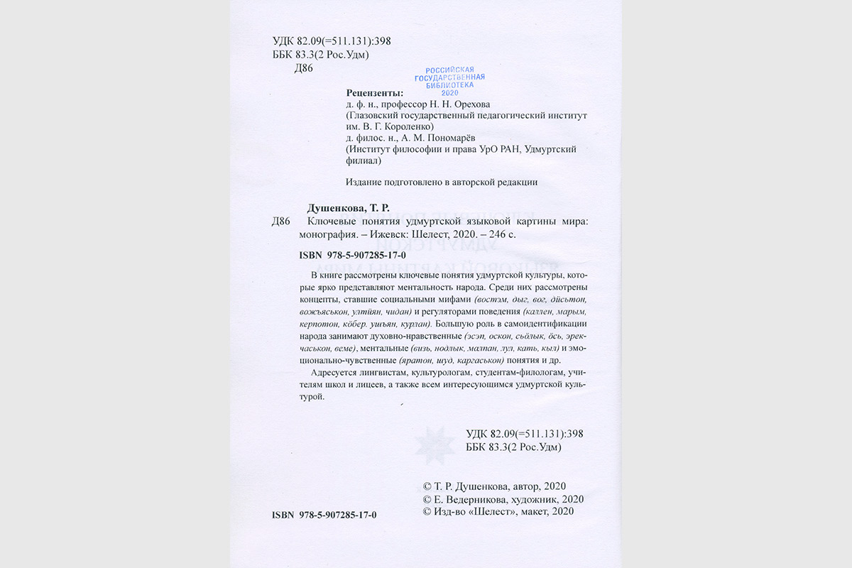 Душенкова, Татьяна Рудольфовна. Ключевые понятия удмуртской языковой картины мира. Ижевск, 2020.