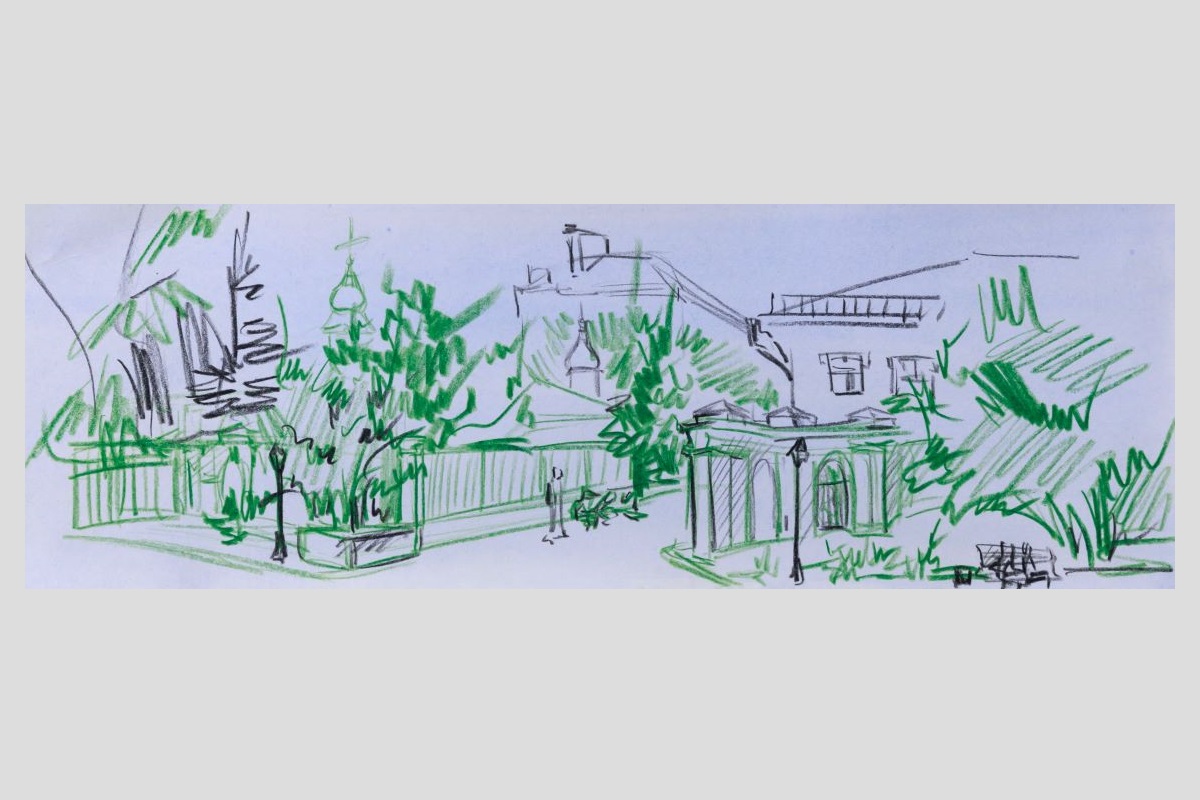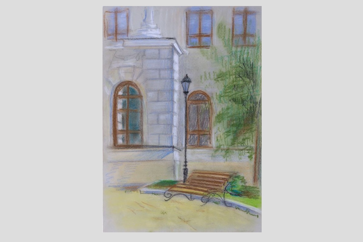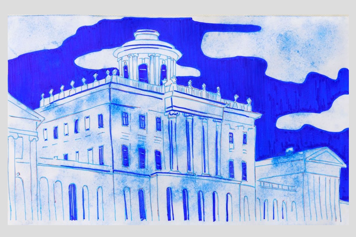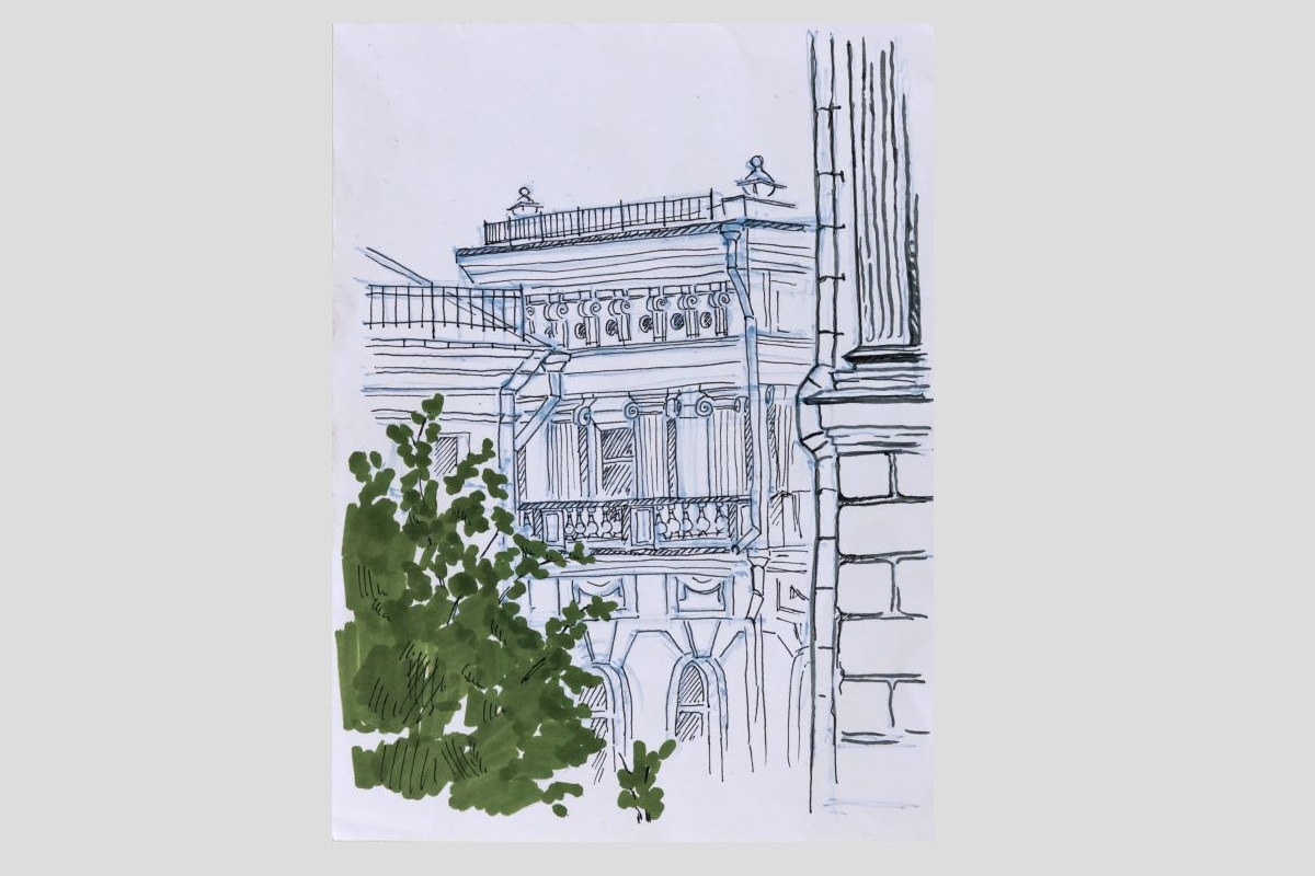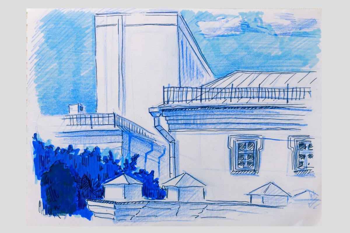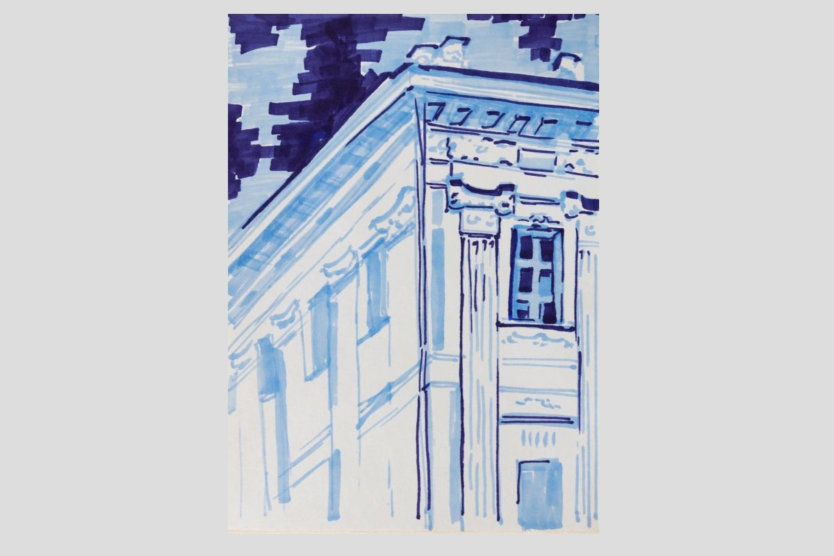 Полина Плесовских. Дворик Пашкова в холодных тонах (карандаш, акриловый маркер)