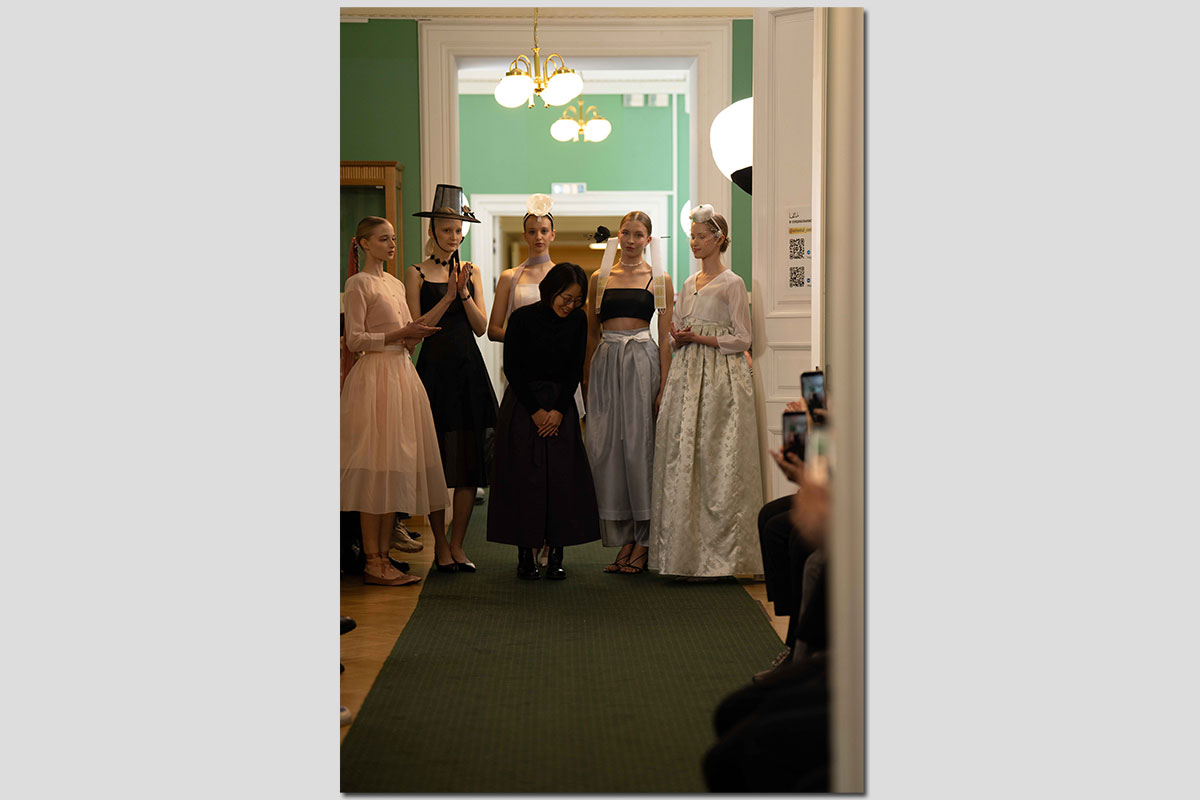 - Ким Мигён, ателье Kkytton («манжет» — последний штрих в ханбоке), показала модные образы для современных девушек. Коллекция состояла из двух частей: дневные наряды и вечерние для променада.