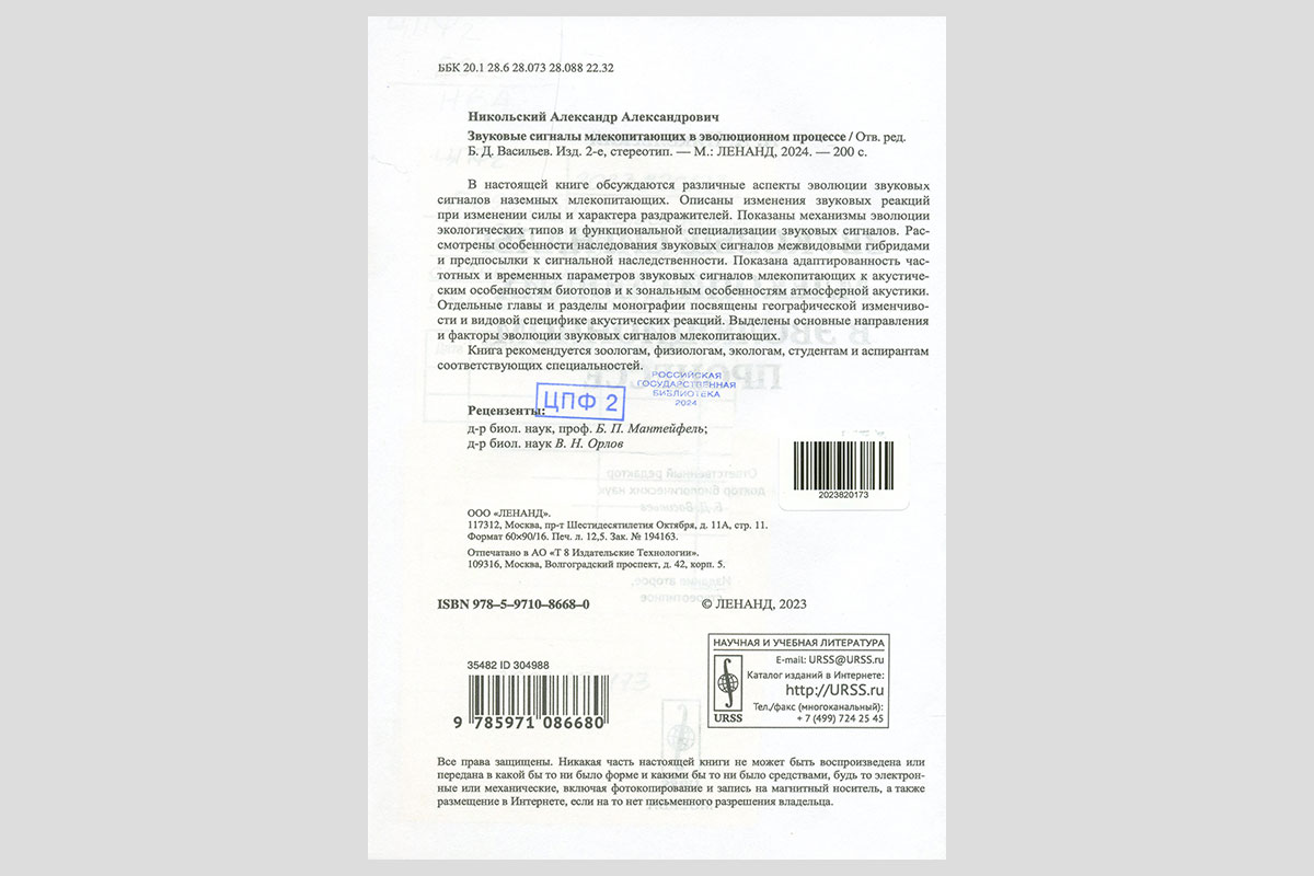 Никольский, Александр Александрович. Звуковые сигналы млекопитающих в эволюционном процессе. Москва, 2024