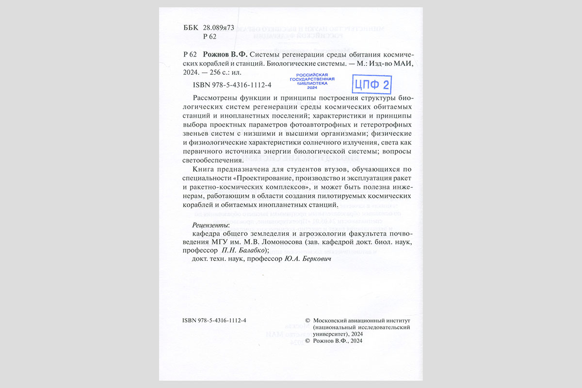 Рожнов, Валерий Феодосьевич. Системы регенерации среды обитания космических кораблей и станций. Биологические системы. Москва, 2024