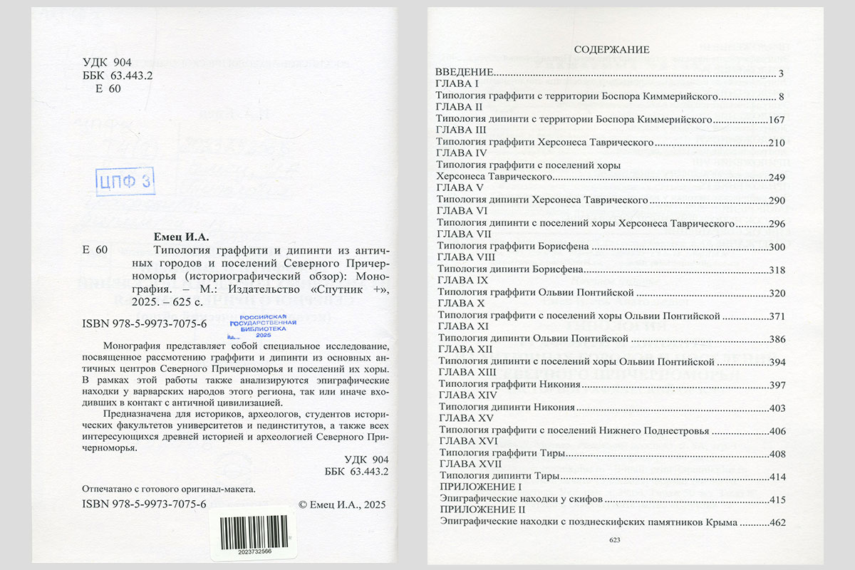 Емец, Игорь Анатольевич. Типология граффити и дипинти из античных городов и поселений Северного Причерноморья: (историографический обзор). Москва, 2025